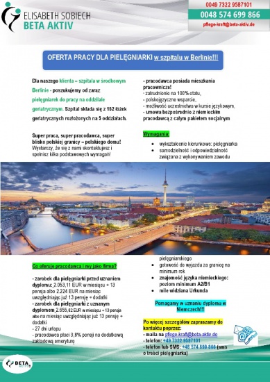 Szpital środkowym w Berlinie  poszukuje od zaraz pielęgniarek do pracy na oddzilale geriatrycznym. Szpital składa się z 152 łóżek geriatrycznych rozłożonych na 5 oddziałach.